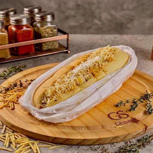 Pão, calabresa, carne de sol na nata, queijo coalho, milho e ervilha, batata palha e queijo ralado.