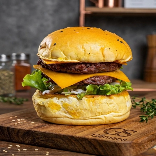 Pão brioche, alface, tomate, hambúrguer e cheddar fatiado.