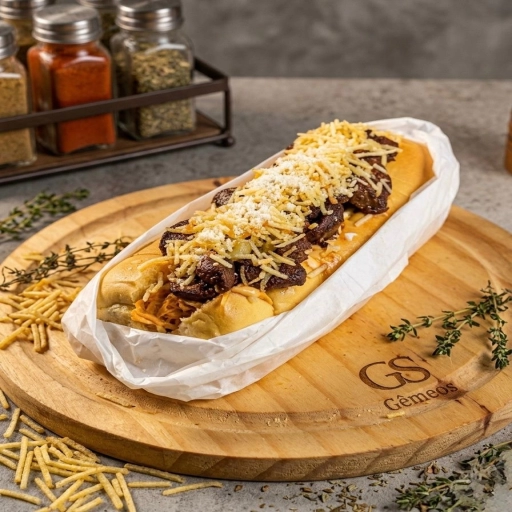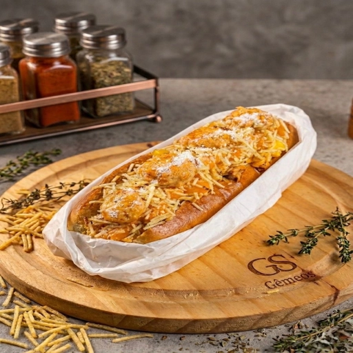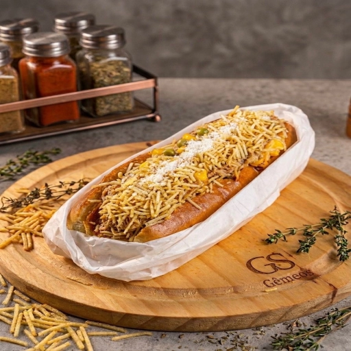 Pão, salsicha, carne de sol na nata, milho, ervilha, batata palha e queijo ralado